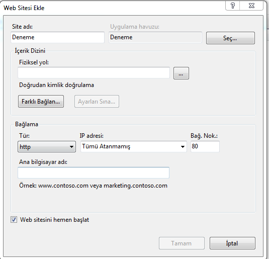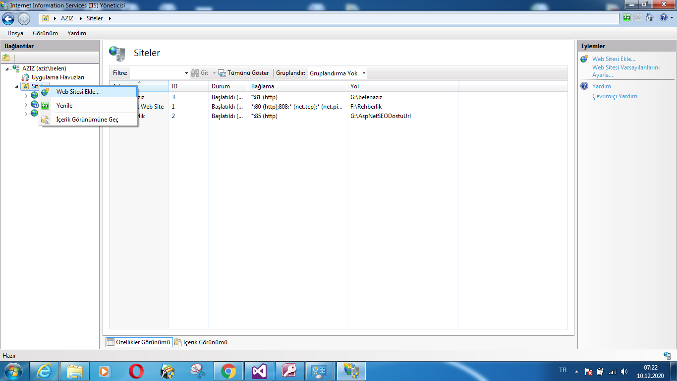 Bundan sonra bir localhostta birkaç uygulamayı çalıştırabilmek için Web Sitesi Ekle veya Sana Dizin Ekle seneçeneğini kullanabiliriz.