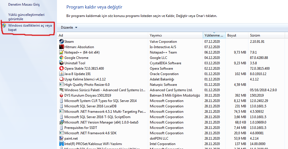 Windows Özelliklerini Aç veya Kapat seçeneği