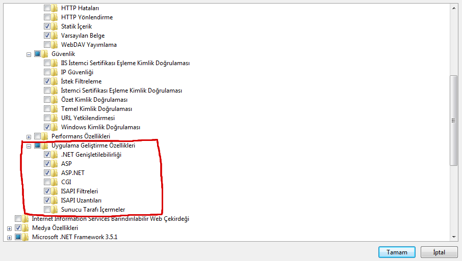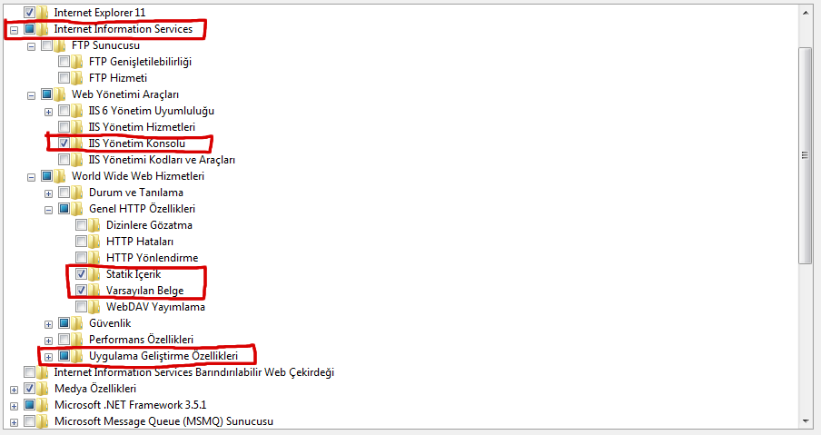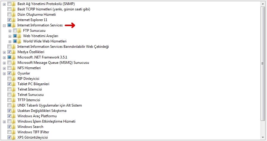 İnternet Information Services seçeneğini işaretleyip alt başlıklarını aşağıdaki bilgiler ve görseller doğrultusunda işaretleyeceğiz.
